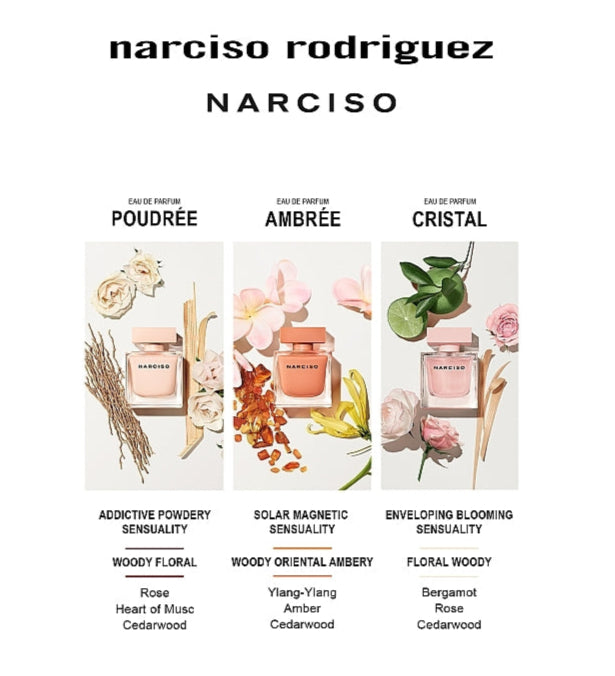 Narciso Cristal Eau de Parfum incarne la lumière intérieure de la femme. C’est une fragrance florale musquée pure et éclatante, construite autour du cœur de musc emblématique de la marque. La composition révèle la fraîcheur des fleurs blanches, la délicatesse de la rose, et la sensualité du cèdre et du bois de cachemire. Une création lumineuse et aérienne, pensée pour refléter l’éclat naturel et la grâce de chaque femme.